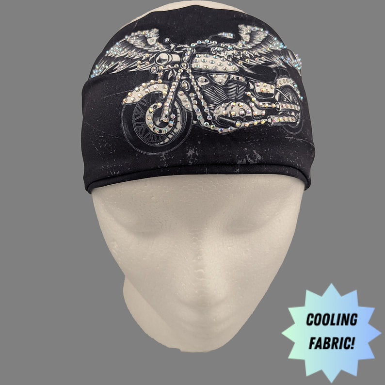 Engineered for cyclists and outdoor enthusiasts, this headband features a striking Bike & Wings sublimation graphic enhanced with rhinestone embellishments. The advanced wet/dry cooling fabric actively wicks sweat while evaporative technology keeps you refreshed during intense activity. Its flat-back design ensures a comfortable, secure fit beneath helmets or hats without bulk or pressure points. Proudly manufactured in the USA, this headband combines performance functionality with eye-catching style for riders who demand both comfort and flair.