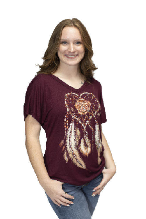Ladies Beautiful Dream Catcher Design Shirt - USA Made - 7009 Embrace bohemian elegance with this expertly crafted short-sleeve dolman top. The relaxed fit drapes beautifully while the eye-catching dreamcatcher graphic—adorned with a heart, flowing feathers, and sparkling rhinestones—commands attention. Constructed from a premium rayon-spandex blend (95% rayon, 5% spandex), this piece delivers exceptional comfort and subtle stretch for all-day wear. Perfect for those seeking to infuse their everyday style with boho-inspired sophistication and understated glamour. USA made quality you can trust.