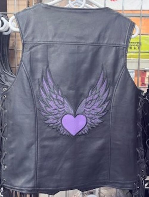 This striking Ladies Black Side Lace Vest combines premium leather with delicate lace detailing, featuring an eye-catching purple heart and wings design. The sleeveless, mid-length silhouette offers versatile styling with a snap closure for easy wear. Functional inner and zipped pockets provide practical storage without compromising the bold aesthetic. Designed in a regular fit for comfortable all-season wear, this piece delivers authentic biker style with artistic flair. Hand wash care preserves the quality of both leather and lace elements. A confident choice for riders and style enthusiasts seeking distinctive, wearable art.