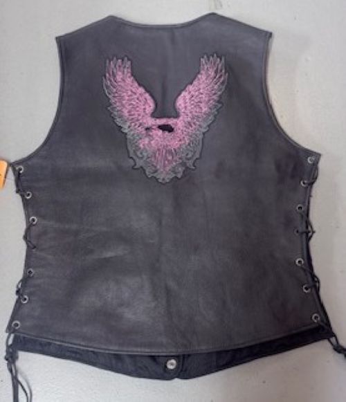 This Ladies Black Leather Vest combines premium craftsmanship with distinctive style. The sleek black leather construction features a striking pink wing design that elevates the classic biker aesthetic, while snap closures ensure easy on-and-off wear. Designed with practical conceal carry pockets and a regular fit, it transitions seamlessly from casual outings to weekend adventures. The mid-length cut and sleeveless silhouette make it an ideal layering piece across seasons, offering both functionality and fashion-forward appeal for those who appreciate quality leather goods with personality.