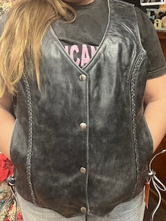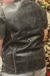 Elevate your wardrobe with this sophisticated gray leather vest, meticulously crafted from premium full-grain leather. The distinctive braid detailing along the front and edges adds artisanal character while maintaining a refined silhouette perfect for layering. Designed for versatility, this piece transitions seamlessly from casual weekend wear to polished professional settings. The structured fit flatters various body types, while quality leather construction ensures durability and develops a rich patina over time. An investment piece that combines timeless style with expert craftsmanship. Conceal Carry Pockets.