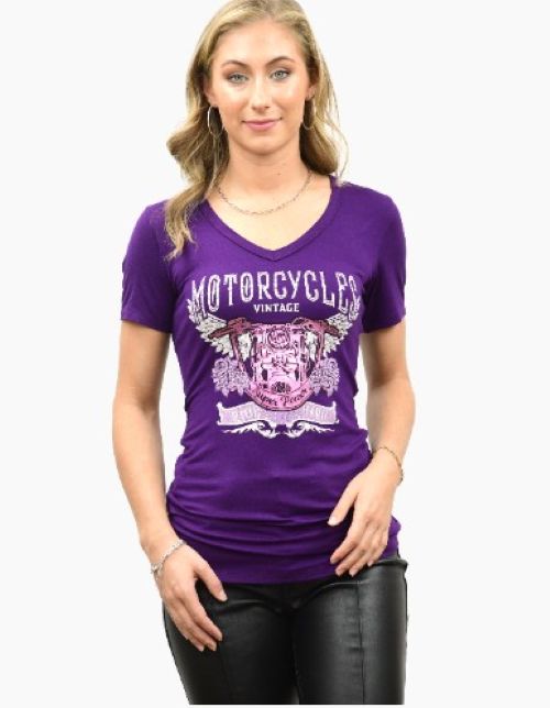 Ladies Beautiful Vintage Motorcycle Design Shirt - USA Made - 270445 This striking purple V-neck tee combines edgy motorcycle aesthetics with everyday wearability. The lavender foil graphic delivers eye-catching detail, while strategic mid-back cuts add contemporary flair. Crafted from a luxurious rayon-spandex blend (95% rayon, 5% spandex), the fabric drapes beautifully and moves with you. Perfect for motorcycle enthusiasts seeking a bold statement piece that balances attitude with comfort. The subtle shimmer of the foil graphic ensures this tee stands out whether dressed up or down. A versatile wardrobe essential that captures vintage-inspired style with modern sophistication.