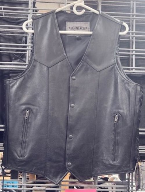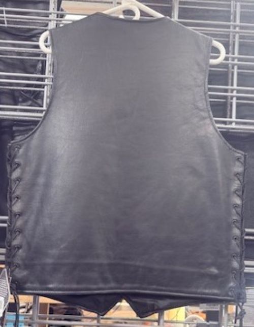 Designed for the serious rider, this tall-cut leather vest combines authentic biker styling with practical functionality. The classic V-neck silhouette features traditional side lacing that allows for a customized fit, while secure snap closures ensure reliable wear on the road. Zippered pockets keep essentials protected during rides, and strategically placed conceal carry pockets add discreet security options. Constructed from quality leather in solid black, this mid-length vest delivers year-round versatility whether you're cruising the highway or heading out for